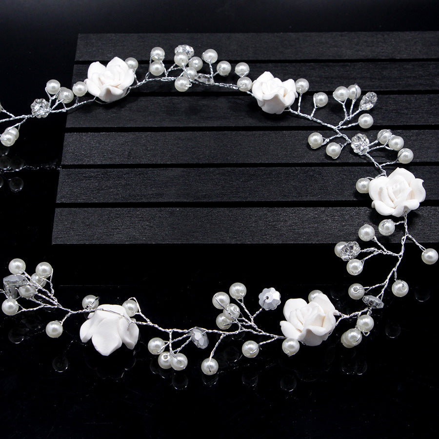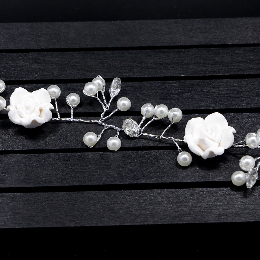 Bride's wedding handmade pearl white flowers and long soft chain hair chain