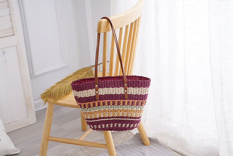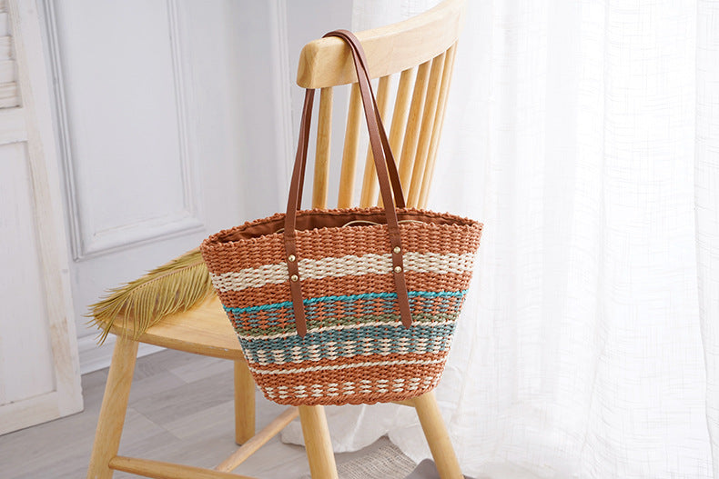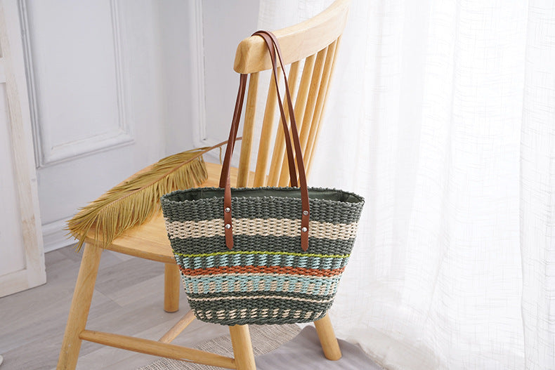 Colorful Striped Grass Braided Soft Leather Put Handbag Large Capacity Braided