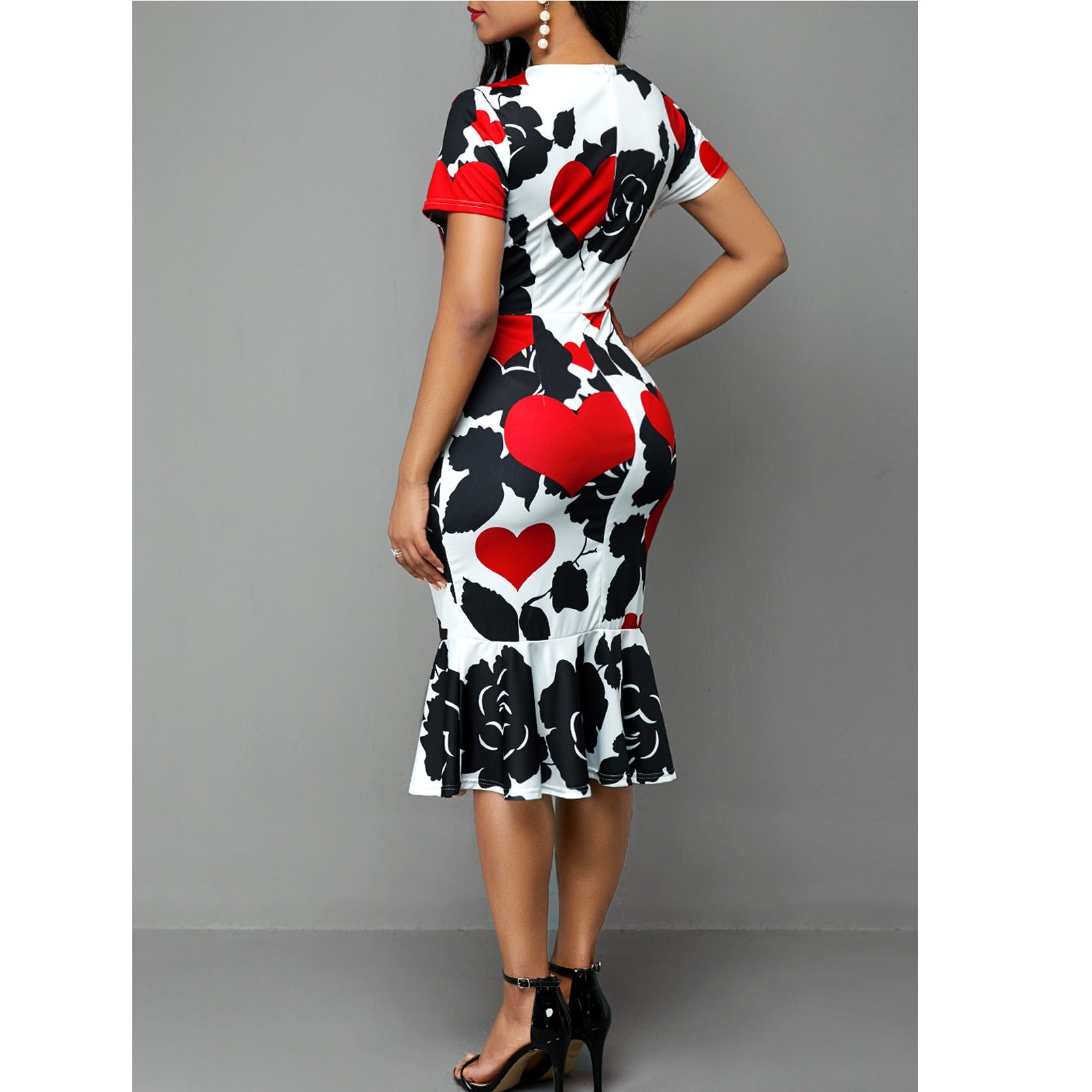 Round Neck Short Sleeve Printed Slim Ruffle Dress