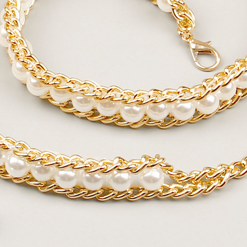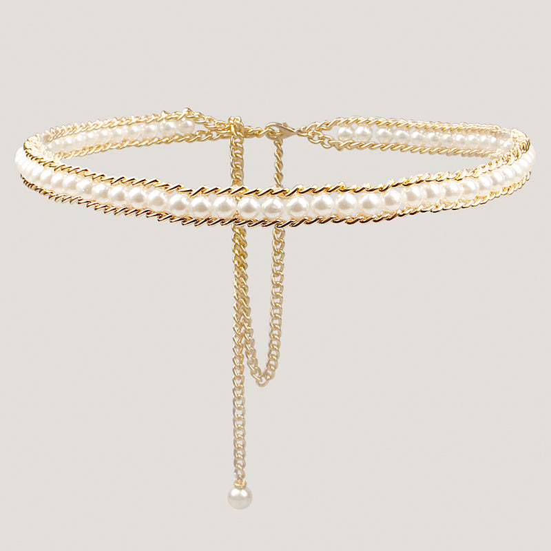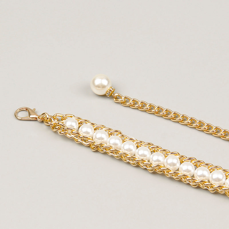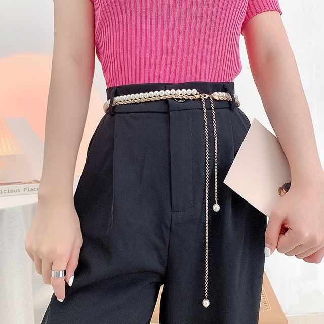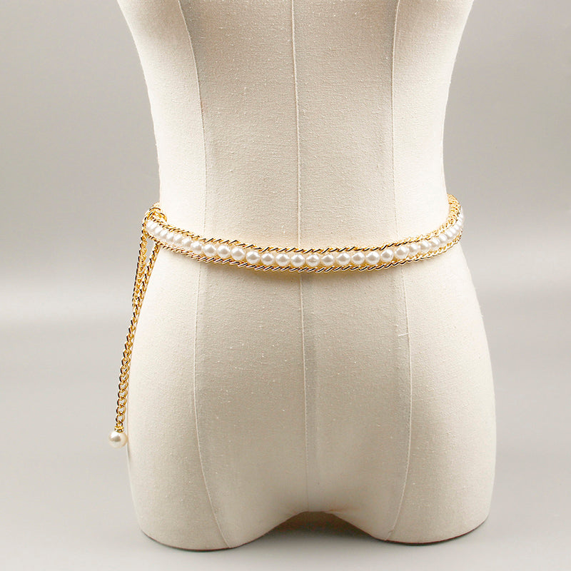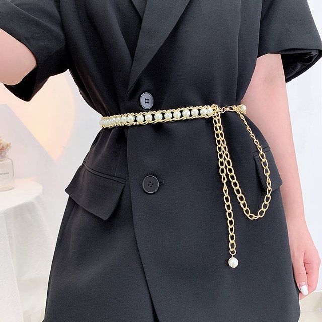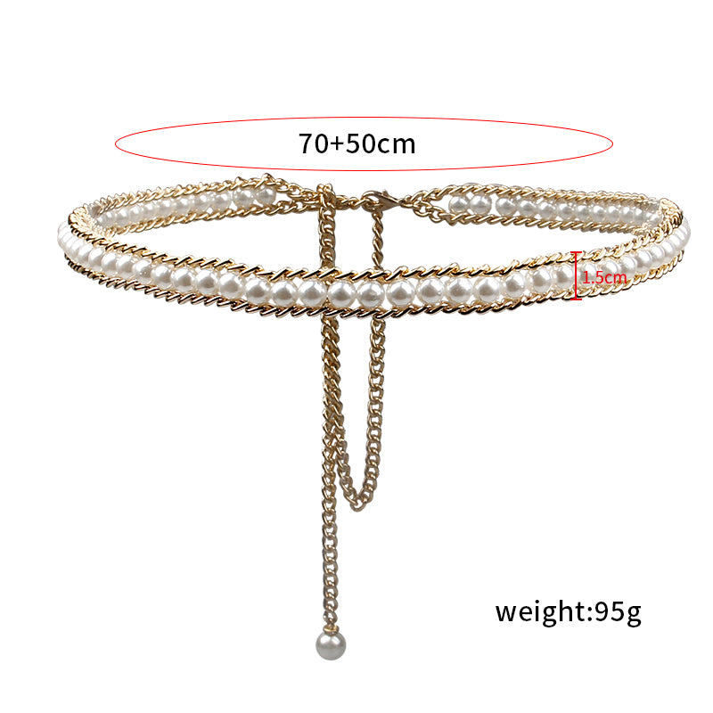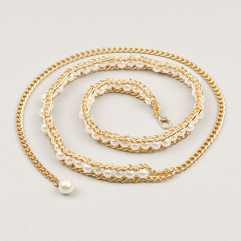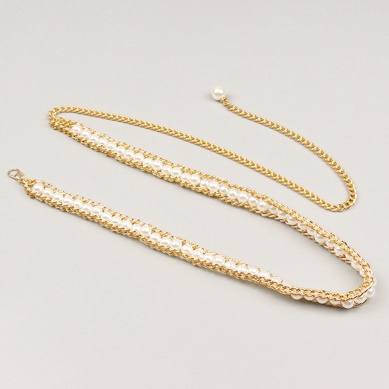 Fashionable And Elegant All-match Pearl Aluminum Chain Summer Dress With Belt Ladies