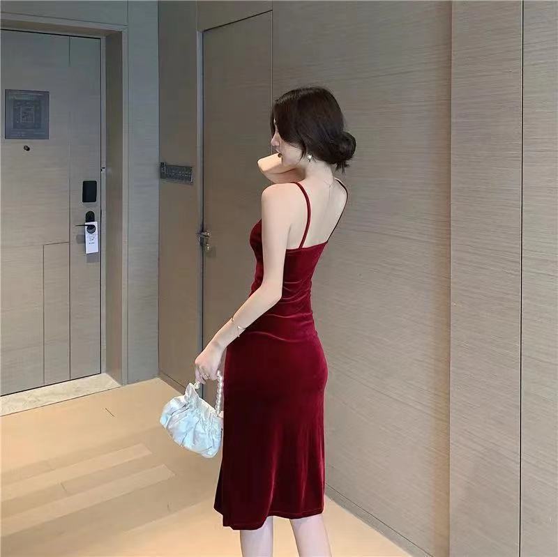Mid-length Gold Velvet Halter Dress