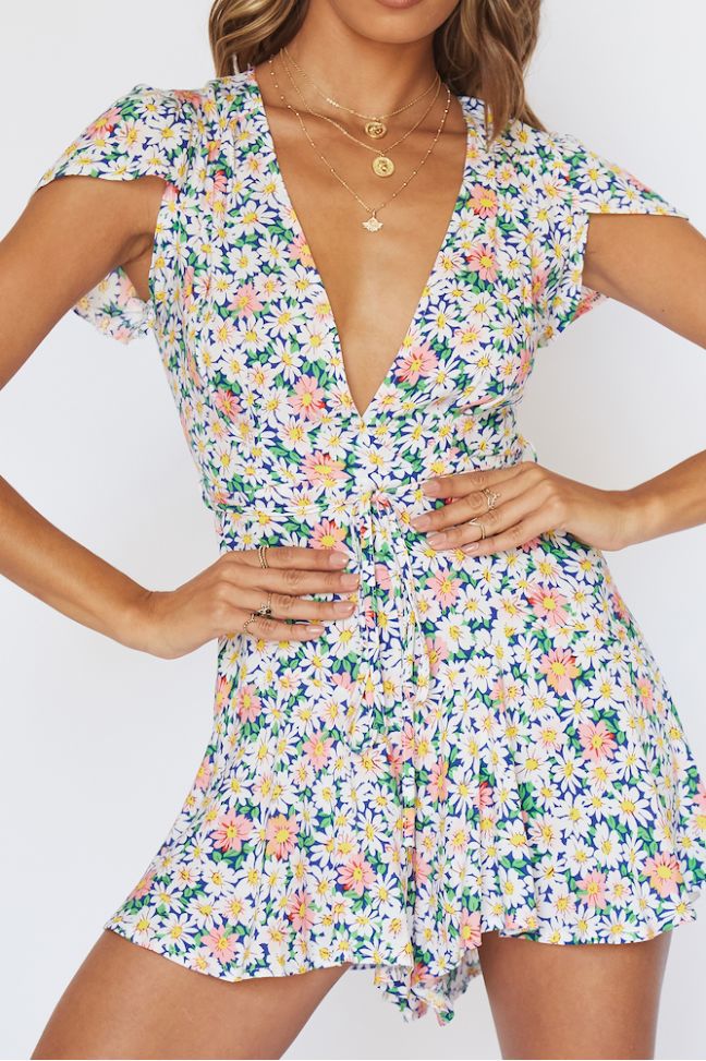 Sexy V-neck Floral Waist Short-sleeved Jumpsuit