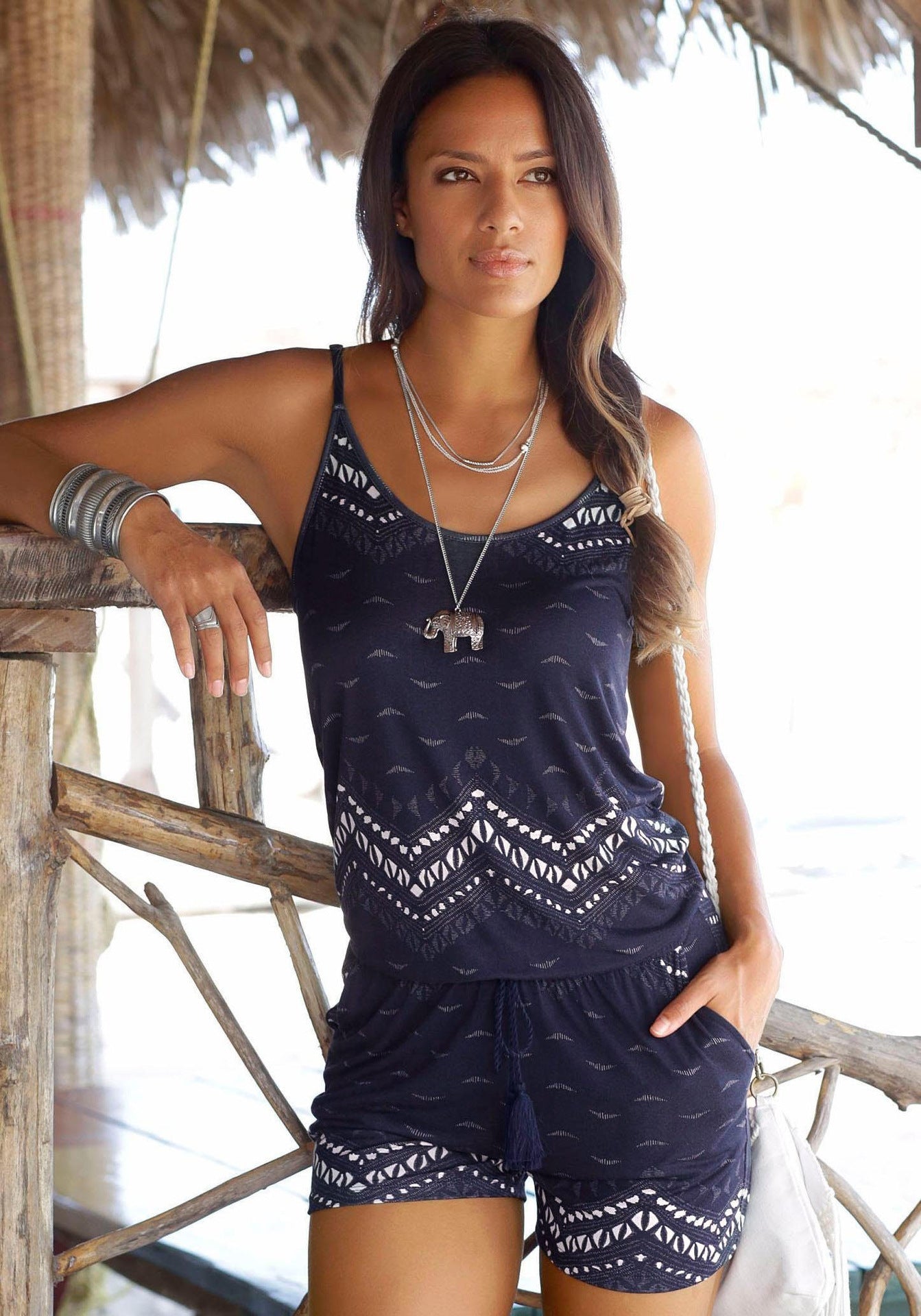 Wave print adjustable belt elastic waist jumpsuit