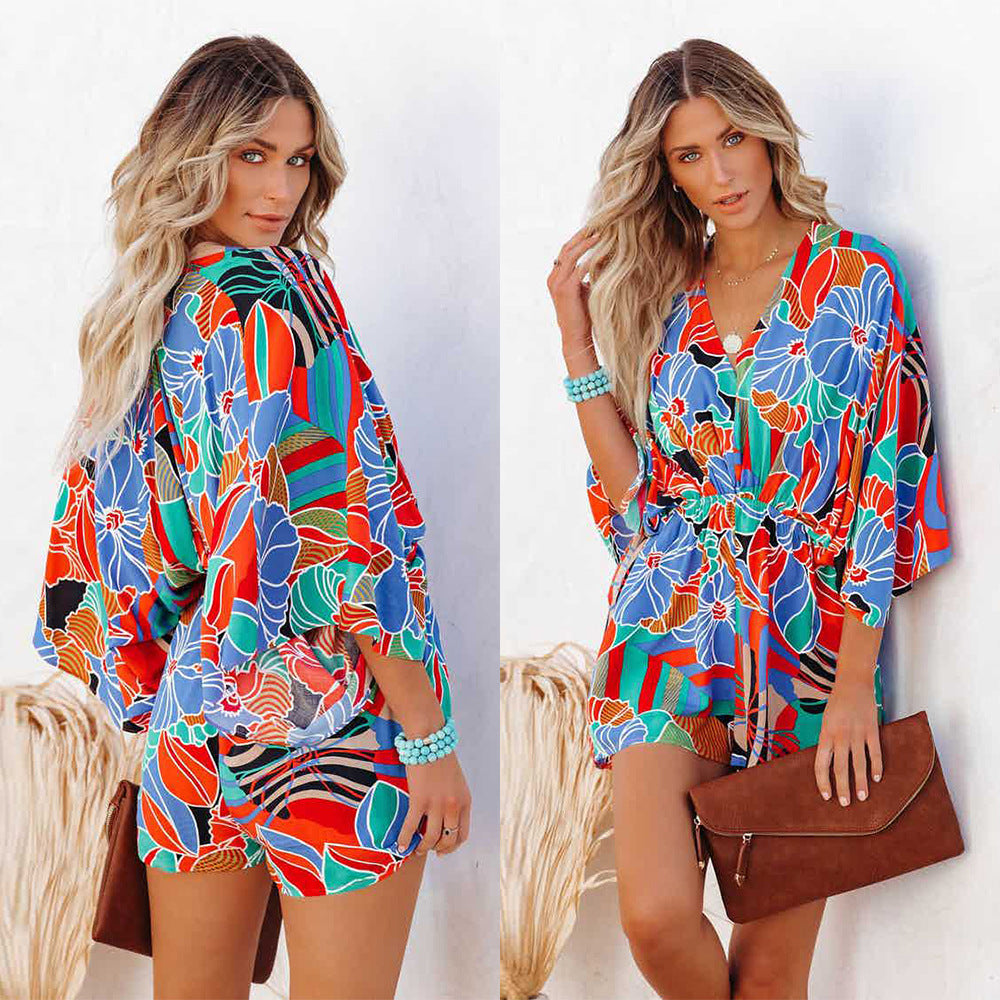 Printed V-Neck Short Sleeve Loose Casual Jumpsuit